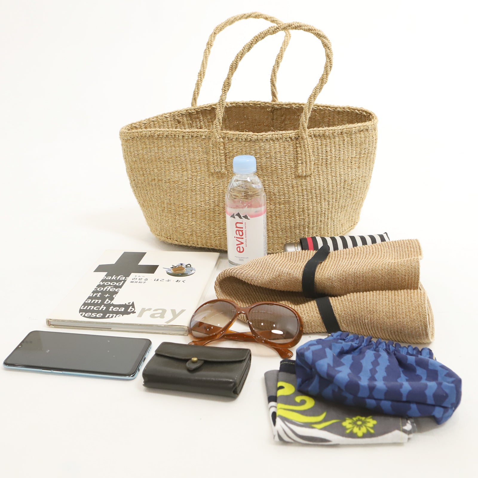 画像(内容例):220㎖ペットボトル・三つ折り傘・ミニ財布・ハンカチ・本(文庫本サイズより大きい)・帽子・ポーチ・サングラス・携帯
