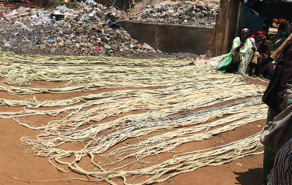 サイザル麻はバスケット以外にもひもやロープにします。水曜のマーケットデーにはサイザルの糸やロープが並びます。