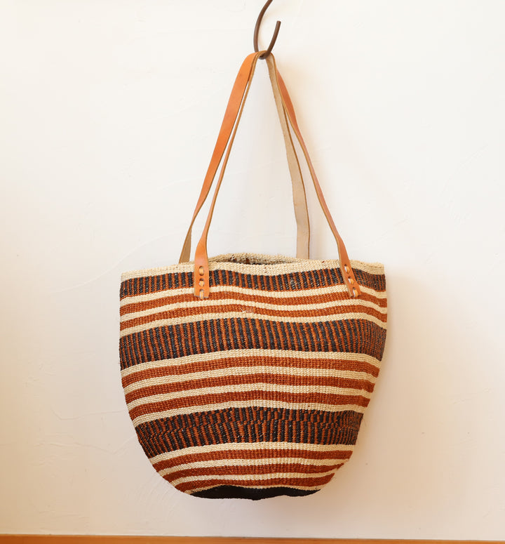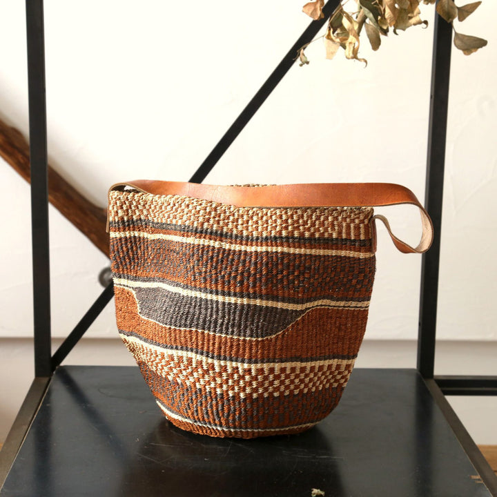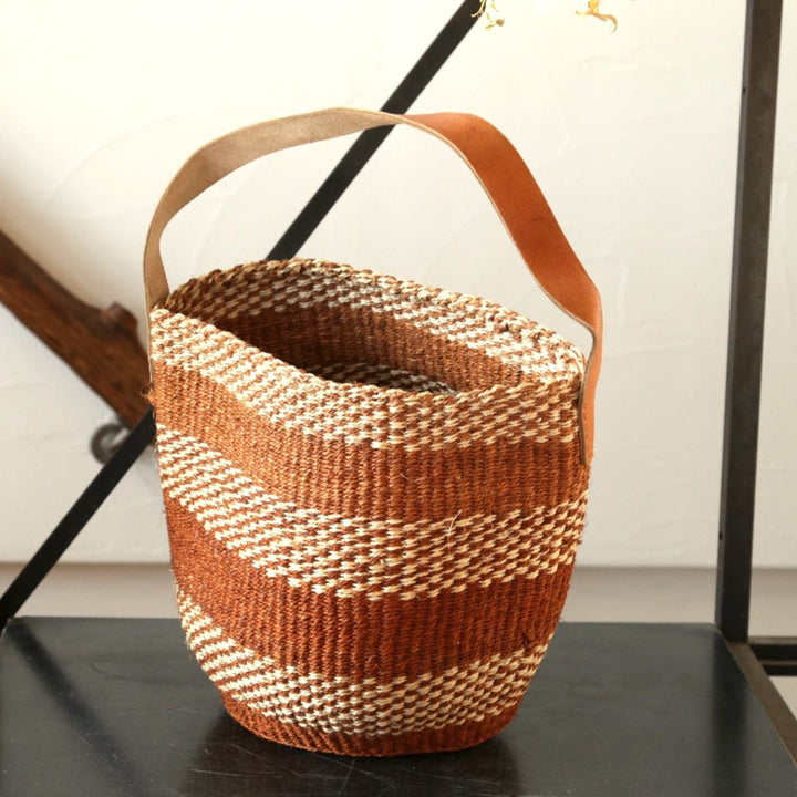 サイザルバスケット M/革巻き1ハンドル 2トーン カーキ・ブラウン