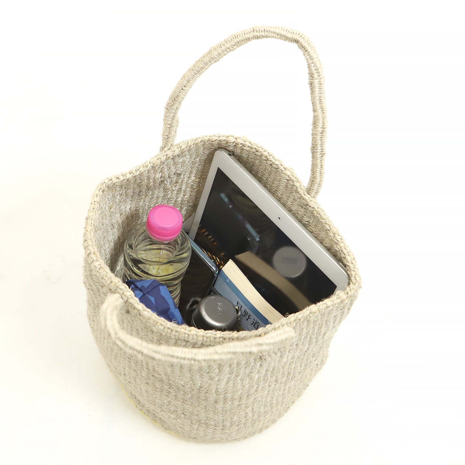 縦長のシルエットのバスケット。持つとバケツ型になり、横長シルエットの多いサイザルバスケットの中では珍しい形です。荷物はあるけど、コンパクトにみせたいときに活躍しそうです。手で持つタイプです。