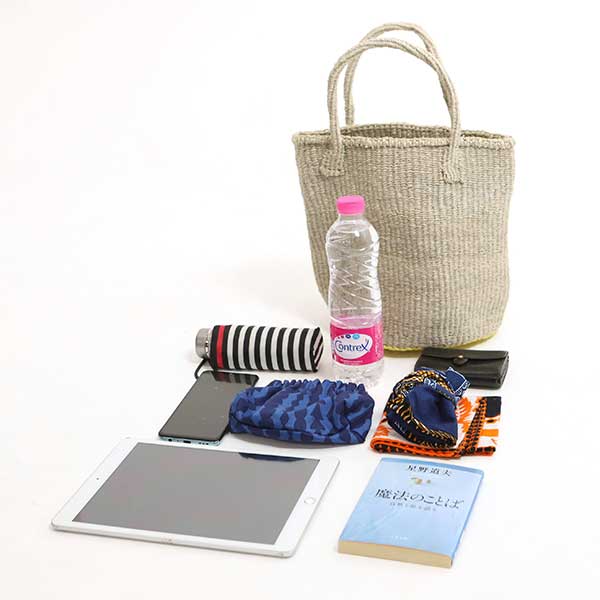 縦長のシルエットのバスケット。持つとバケツ型になり、横長シルエットの多いサイザルバスケットの中では珍しい形です。荷物はあるけど、コンパクトにみせたいときに活躍しそうです。